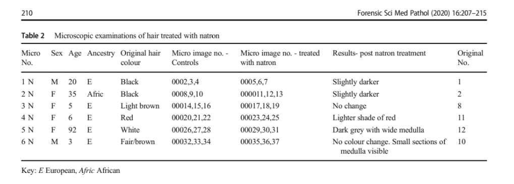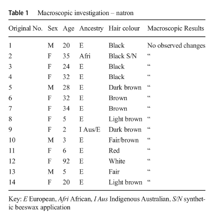 จากตารางที่ 1 เป็นการศึกษาเส้นผมโดยใช้ตัวอย่างที่เป็นผมของเชื้อชาติยุโรป(E), แอฟริกัน (Afri), ออสเตรเลียน (I Aus) และยังมีแบบผสมเส้นใยสังเคราะห์ (S/N) ซึ่งมีการเคลือบด้วยขี้ผึ้งประกอบ ทั้งหมดผ่านการหมักนาตรอนภายใต้สภาวะจำลองความร้อนและแห้งแบบทะเลทรายเป็นเวลา 40 วัน ก่อนจะนำมาส่องด้วยกล้อง Macroscopic