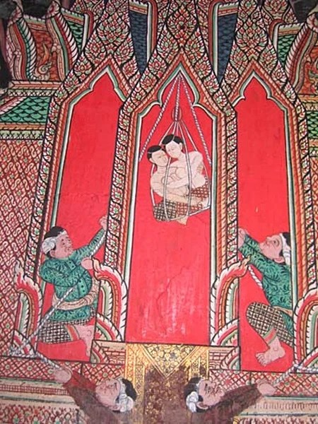 นอกจากหลักฐานทางวรรณกรรมแล้ว ยังมีรูปแบบของภาพจิตรกรรมฝาผนัง โดยพบที่วิหารวัดคงคาราม อ.โพธาราม จ.ราชบุรี โดยมี 2 ภาพสำคัญคือภาพนางในประคองเต้านมของอีกฝ่ายคล้ายหยอกเย้า