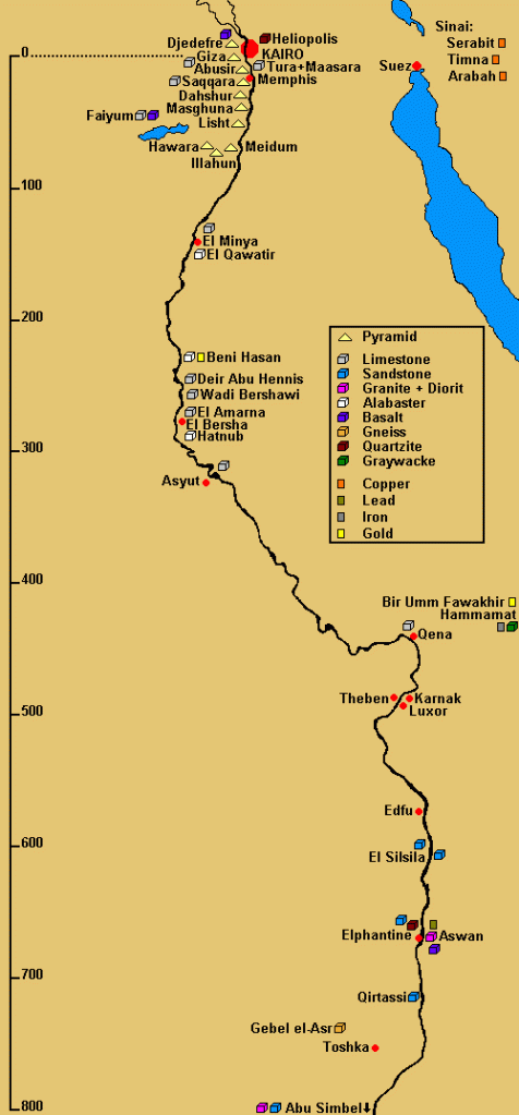 เครื่องหมาย ▲ ในแผนที่คือตำแหน่งของพีรามิด ในขณะที่ ❐ หมายถึงที่ตั้งของเหมืองหินที่ใช้ในการก่อสร้างโบราณสถานต่างๆ ของอียิปต์โบราณ โดยแบ่งแยกประเภทของหินตามสีที่ระบุภายในภาพ