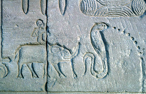 Cobra and elephant, sunk relief on west exterior wall of temple, Dandara, Egypt.Photographer : SHP