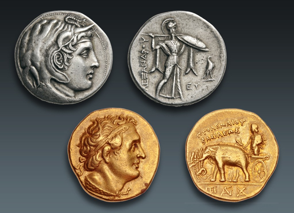 เหรียญทองด้านหนึ่งเป็นภาพของอเล็กซานเดอร์มหาราชกับช้างศึก