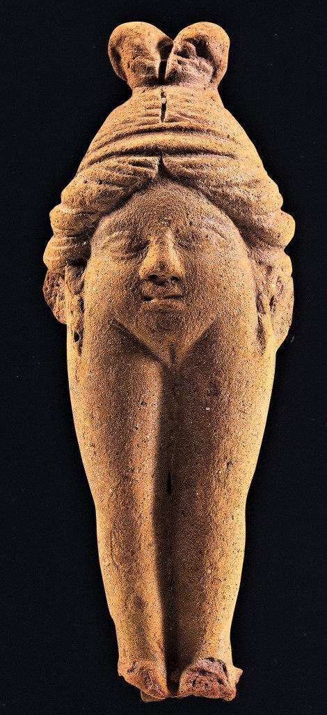- รูปปั้นสตรีนั่งยองโดยมีมือทั้งสองคว้าจับลงไปบริเวณอวัยวะเพศ
