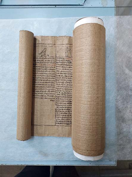 ม้วนพาไพรัสถูกนำไปศึกษาและทำการอนุรักษ์ที่ห้องแล็บของพิพิธภัณฑ์อียิปต์ตรงจัตุรัสทาห์รีร์ (Tahrir) เมื่อทำการคลี่ม้วนออกเพื่อถอดความจารึกจึงพบว่าม้วนคัมภีร์ฯ มีความยาวทั้งสิ้น 16 เมตรหรือ 52.5 ฟุต ตัวอักษรแบบเฮียราติก (Hieratic) ส่วนมากเขียนด้วยหมึกสีดำ แทรกด้วยหมึกสีแดงเป็นบางส่วน